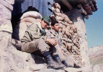 فروردین سال 1365، نوار مرزی کیورود، برده رش، چومان و... از راست: پرویز بهرامی و محمدرضا مرادخانی